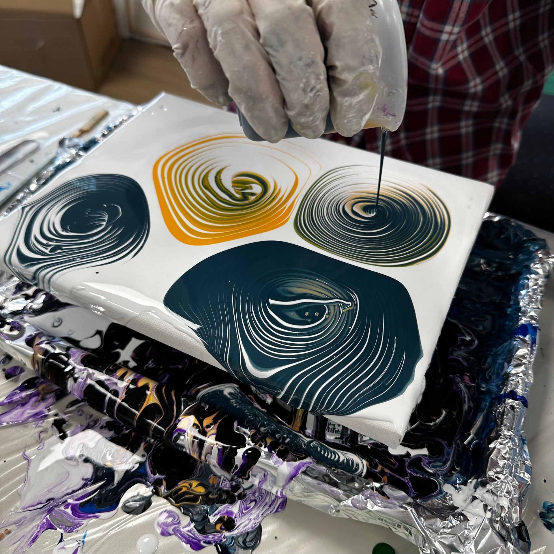Aber Aufgeben? Nicht mein Stil! Ich bin wie ein Pinscher: wenn ich etwas einmal angepackt habe, gebe ich nicht auf. Ich habe verschiedene Mischmethoden ausprobiert und meine kleinen Pouring Kurse im Atelier hier in Dieburg als Labor genutzt – bis es endlich Klick machte.