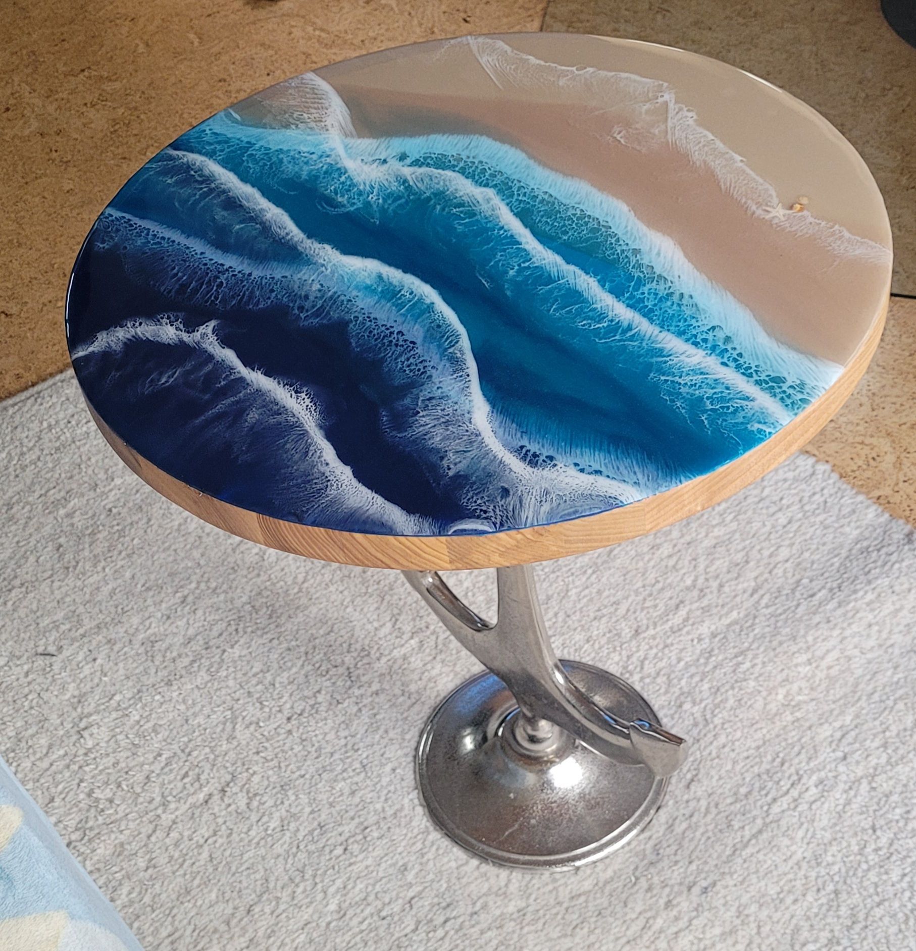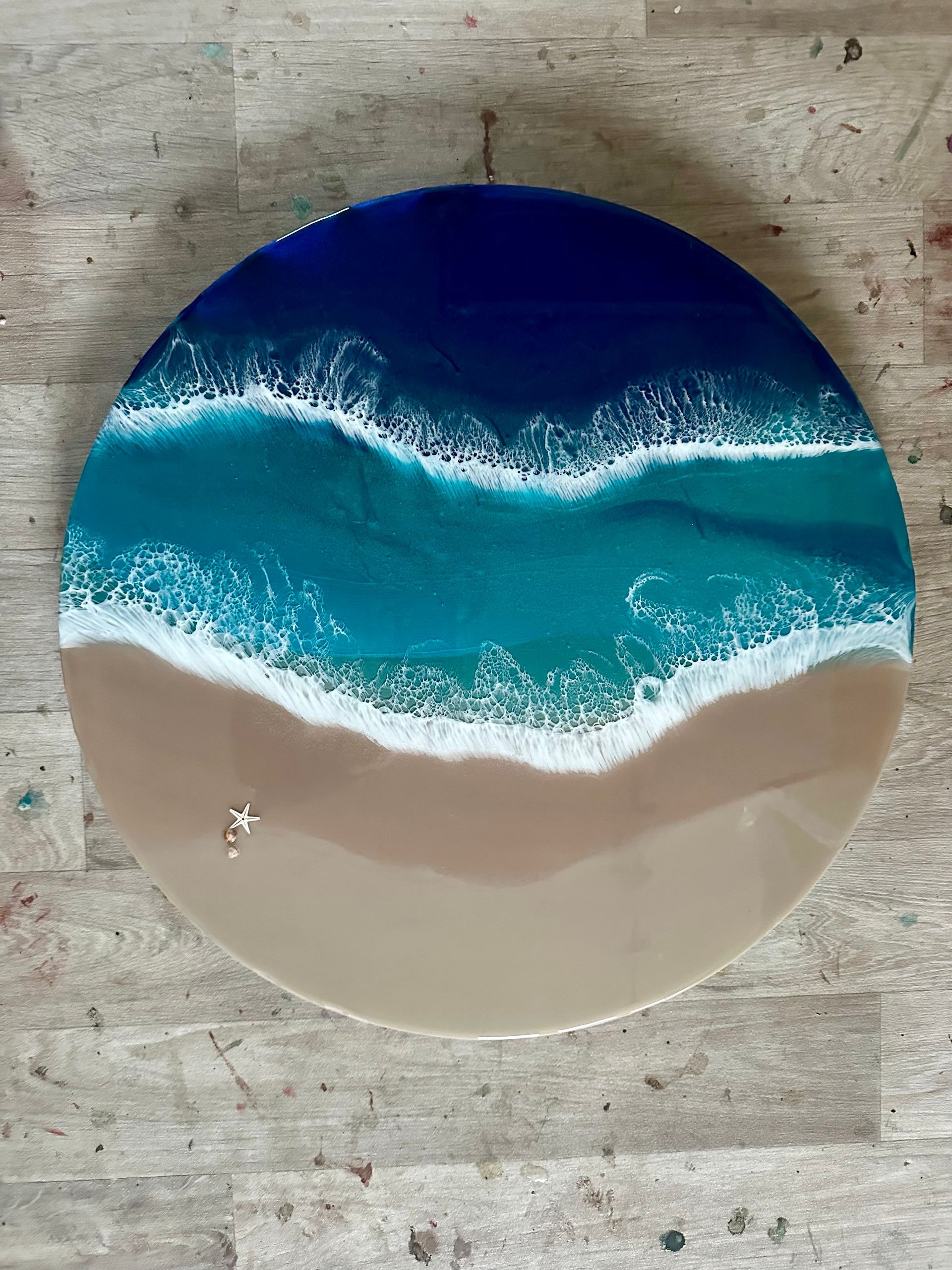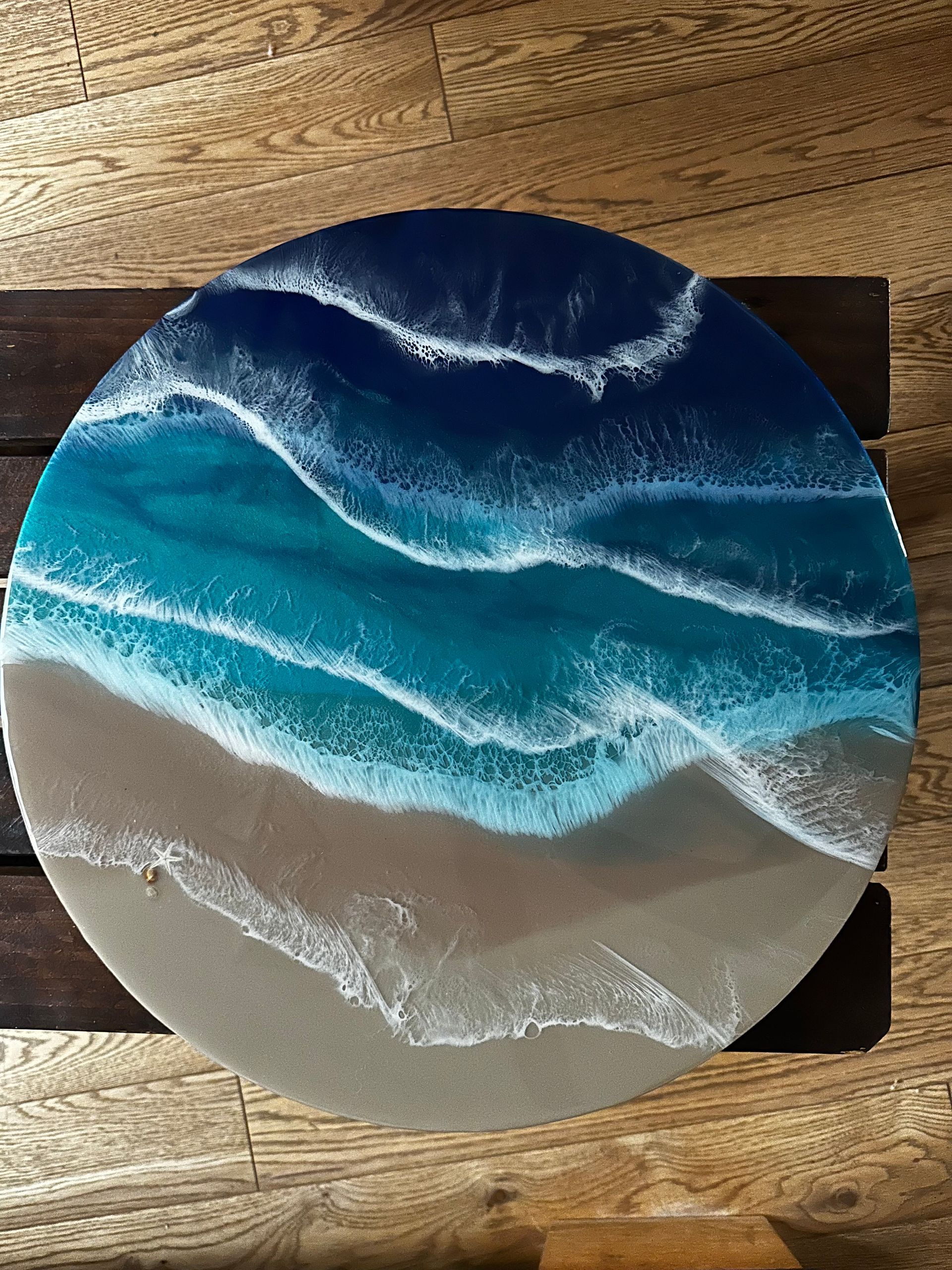 Zürst habe ich die Holzoberfläche in den Farben grundiert, die ich innerlich schon gesehen habe. Dann folgten Schichten aus Kunstharz (Resin), durchzogen von Glimmerpigmenten, die dem Bild Licht und Tiefe verleihen. Beim Einsatz des Heissluftgebläses wurde das weisse Pigment bewegt, bis es aussah wie Wellenschaum. Diese Fluid Art Technik liebe ich besonders, weil sie lebendige Strukturen schafft, die natürlich und doch magisch wirken.